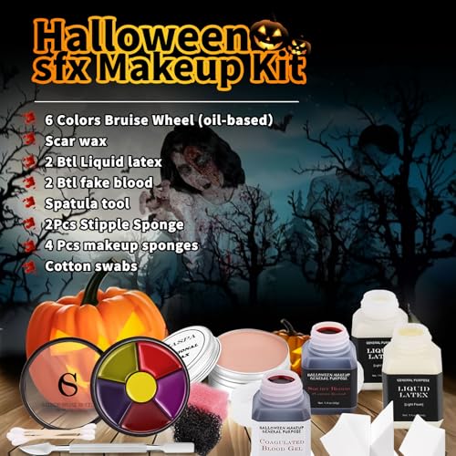 CHASPA Halloween Liquid Latex Special Effects SFX Makeup Kit – Scar Wax + 2 Btl Liquid Latex + 2 Btl Fake Blood + Spatula Tool + 2Pcs Stipple Sponge + 4Pcs Makeup Sponges + Cotton Swabs