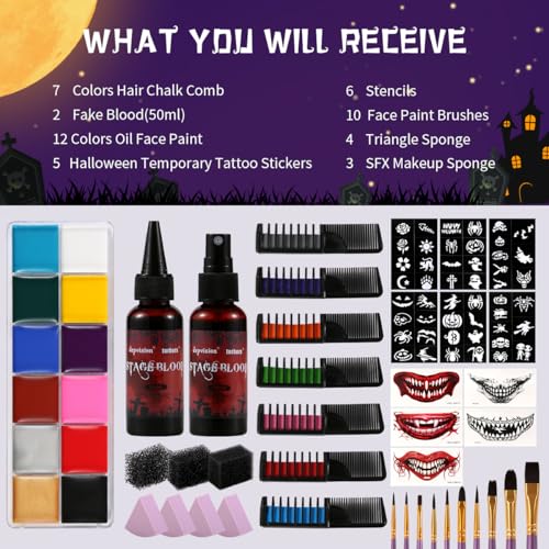 Depvision Halloween Kit Includes: 2 fake blood(50ml), 12 colors oil face paint, 7 colors hair chalk, 5 pieces halloween temporary tattoo stickers, 10 pieces face paint brushes, 4 pieces triangle sponges, 3 pieces SFX makeup sponges and 6 pieces face paint stencils.