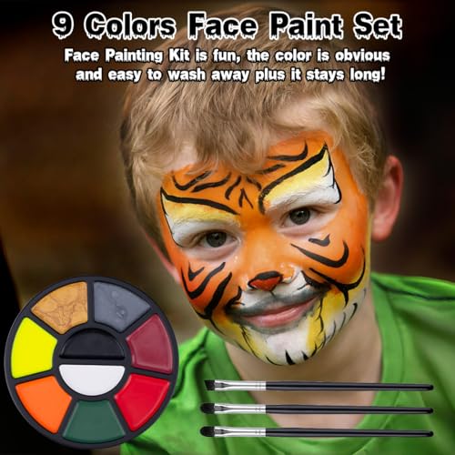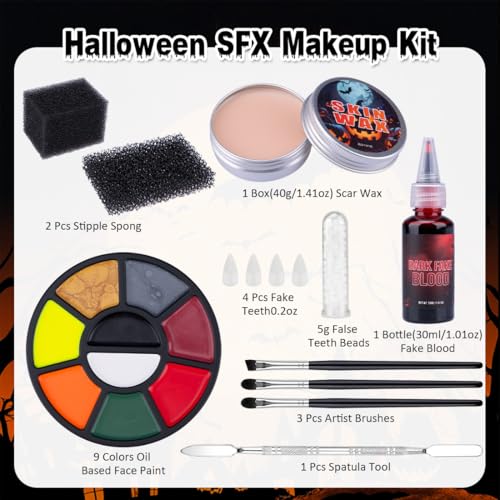 Halloween SFX Makeup Kit – 9 Colors Face Body Painting Kit+3 Pcs Artist Brushes+Scar Wax with Spatula Tool+ Fake Blood Splatter Spray+4 Pcs Fake Teeth+0.2oz False Teeth Beads+2 Pcs Stipple Spong