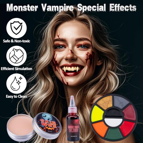 【Most Complete Halloween Makeup Kit】Perfect for all your spooky needs, including 9 colors bruise makeup palette, scar wax(40g/1.41oz)with double ended spatula tool, fake blood splatter spray(30ml/1.01oz), 2pcs stipple sponges,3pcs artist brushes, 4pcs fake teeth,and false teeth beads(0.2oz/5g), will help you to create realistic zombie SFX makeup with ease and confidence!