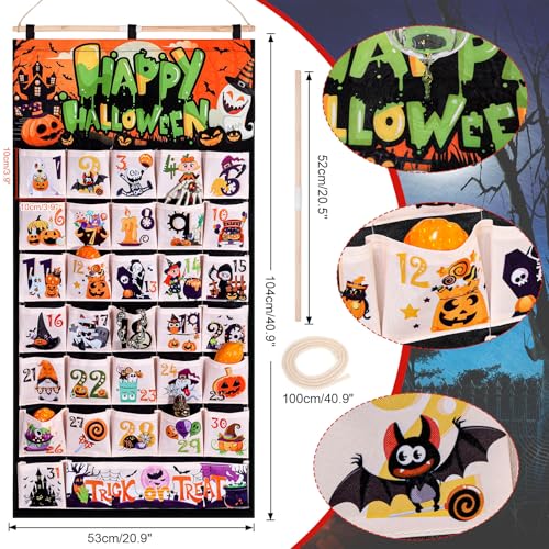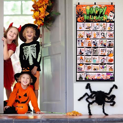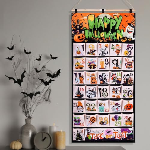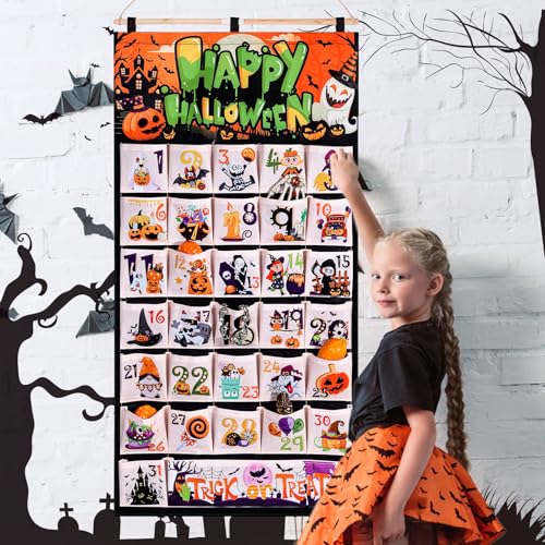 31 Days of Fun October Countdown to Halloween Calendar: Create the Excitement and Anticipation of Upcoming Halloween! Each pocket represents a day leading up to Halloween. Consider filling each pocket with a small treat, a Halloween-themed toy, a joke or riddle, or a fun activity for the day. You can have a designated person each day to open the pocket and reveal the surprise inside. This can be a fun way to involve the whole family or group in the Halloween festivities.