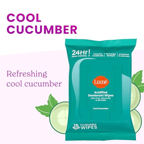 Lume Acidified Deodorant Wipes – 24 Hour Odor Control – Aluminum Free, Baking Soda Free, Skin Loving – Flushable – 15 Count (Pack of 3) (Cool Cucumber)
