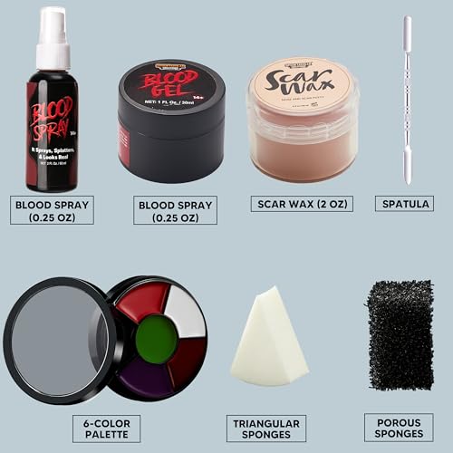 Quantity: This kit offers quantities of key components. You’ll receive 2 oz of skin wax. 1 fake blood gel.1 spatula. 0.25 oz of spray. 2 sponges. 3 triangular sponges. and a 6-color palette (red. white. black. green. purple. and blue). Ample supply ensures multiple applications and creative possibilities.